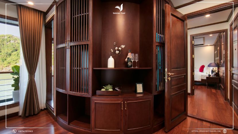 Phòng nghỉ trên du thuyền sang trọng tiêu chuẩn 5* (có bồn tắm và ban công riêng trong phòng) nhìn ra toàn cảnh Vịnh Lan Hạ.
